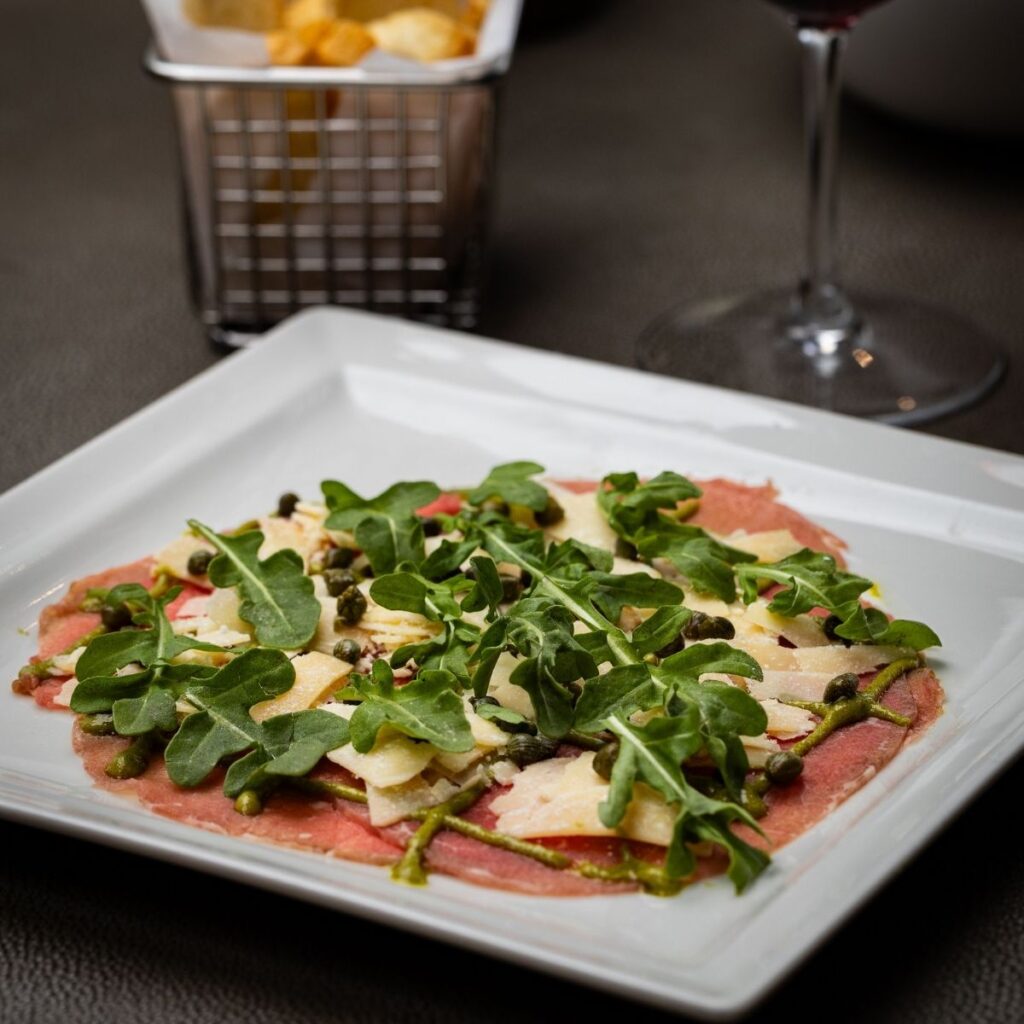 Thin slices of raw beef tenderloin, garnished with fresh arugula and shaved Parmesan, served alongside crispy crostini.