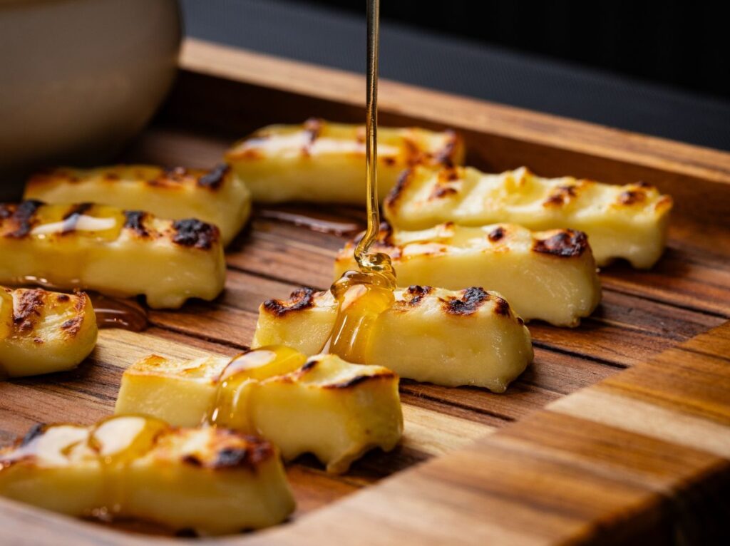 Traditional Brazilian coalho cheese, grilled until lightly crisp on the outside and soft inside.