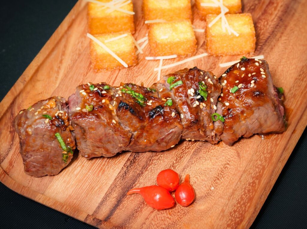 Lean, tender filet mignon seasoned with butter and herbs, grilled and served hot from the skewer.