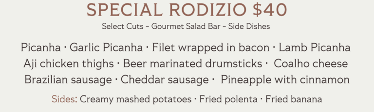 Join us Fridays and choose between our Gourmet Bar with optional à la carte selections or our Special Rodizio.